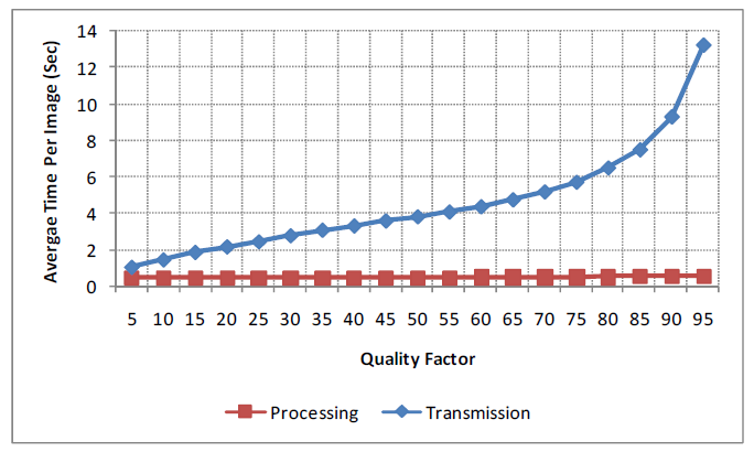Penelitian berkaitan adalah kinerja kompresi dan transmisi menggunakan IJG (Independent JPEG Group) library pada platform Imote2 dengan TinyOS berdasarkan hasil penelitian oleh Mowafi (2010). Skenario berupa koneksi single-hop atau point-point dimana perangkat JSVN melakukan kompresi JPEG terhadap citra terlebih dahulu sebelum melakukan transmisi. Citra dikompresi dengan quality factor lipatan 5 dari 95-5. Diukur waktu dan drop tegangan saat kompresi dan transmisi serta diukur PSNR citra. Hasil pengukuran menunjukan konsumsi waktu dan tegangan terhadap proses kompresi citra relatif sama terhadap nilai quality factor, dengan nilai mendekati 0. Sedangkan hasil pengukuran transmisi menunjukan memerlukan waktu dan tegangan rata-rata 14 detik dan 0.45 mV pada quality factor 95 dan menurun hingga 1 detik dan 0.03 mV pada quality factor 5. Rentang PSNR dari quality factor 95-5 adalah 47-28 dB.Sehingga kompresi citra JPEG membantu untuk menghemat waktu dan energi dalam transmisi citra. Hasil penelitian dapat dilihat dari pada Gambar 2.5.
